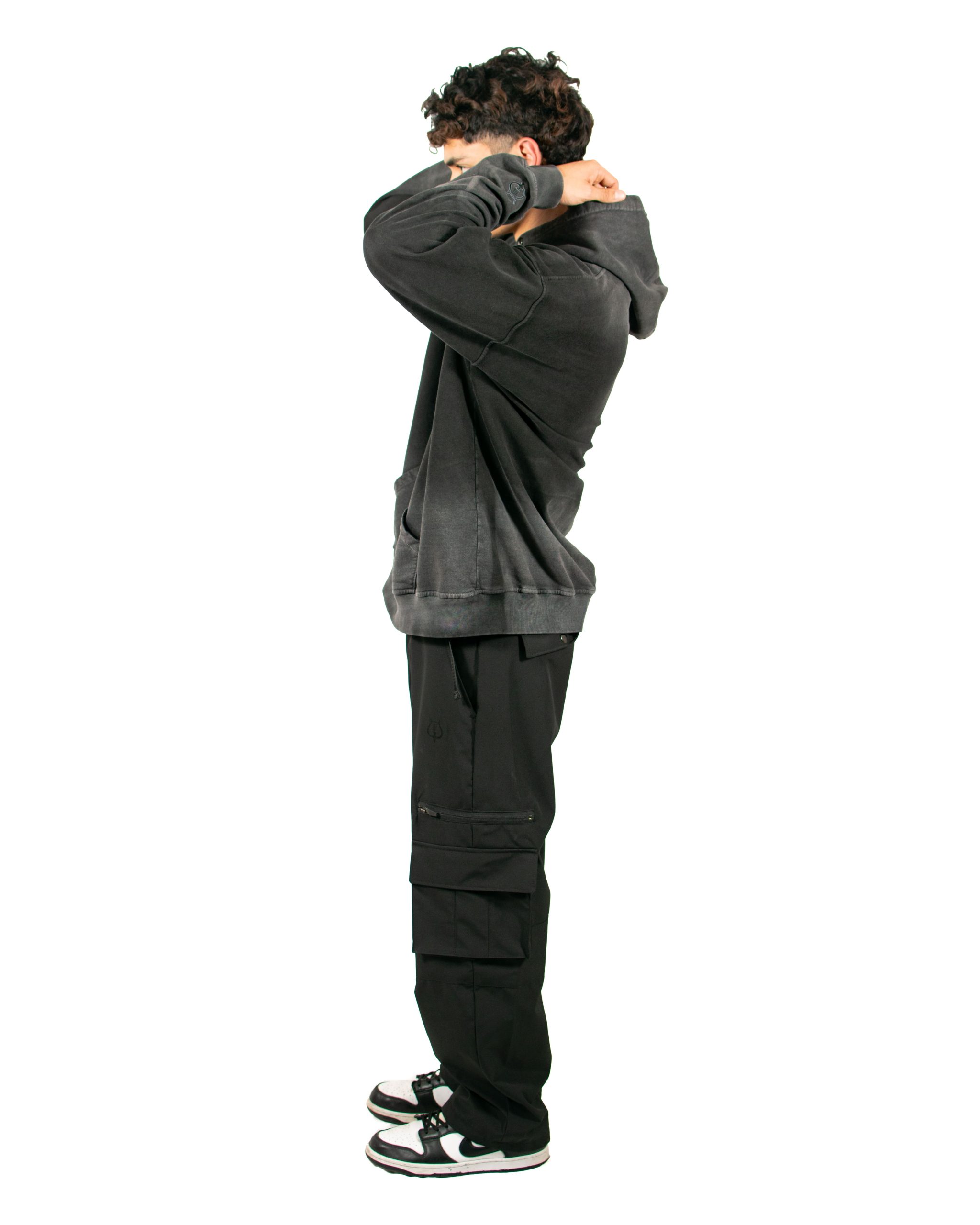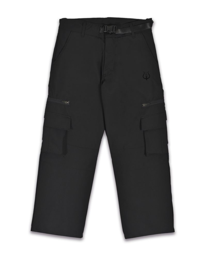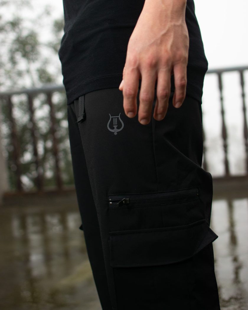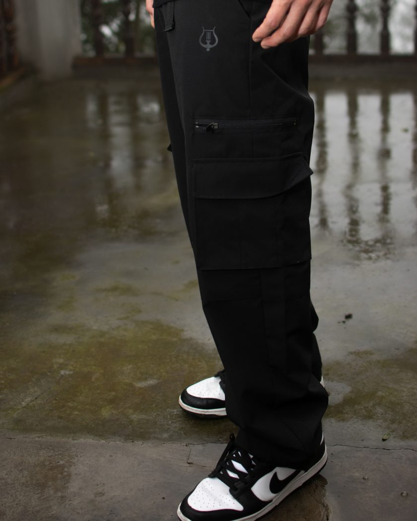 Pantalón cargo cortaviento negro impermeable. Diseñado con bolsillos funcionales y cierres YKK de alta resistencia. Su forro de algodón con tela hermética mantiene una temperatura cálida y confortable. Incluye una correa regulable integrada para un ajuste cómodo y preciso.