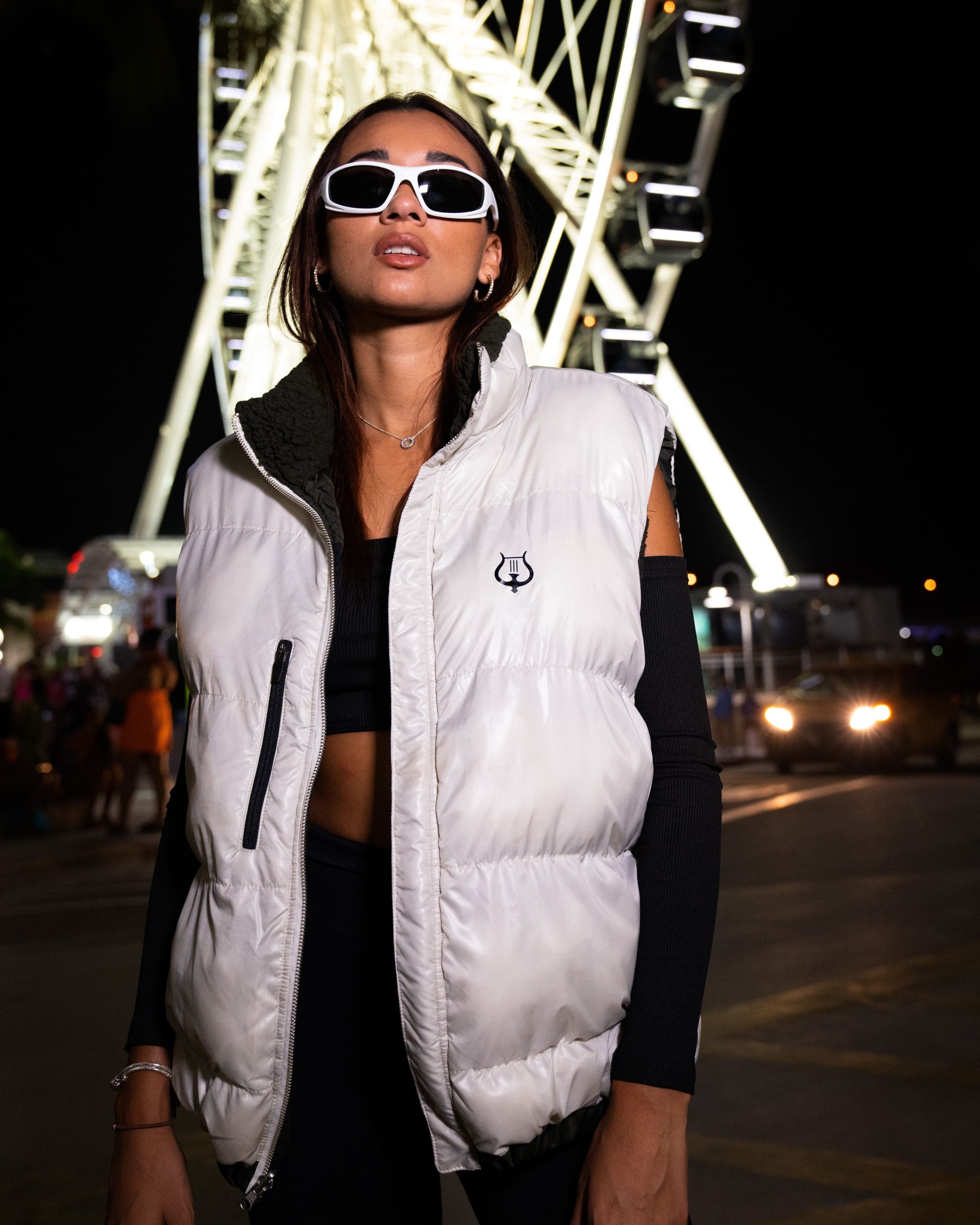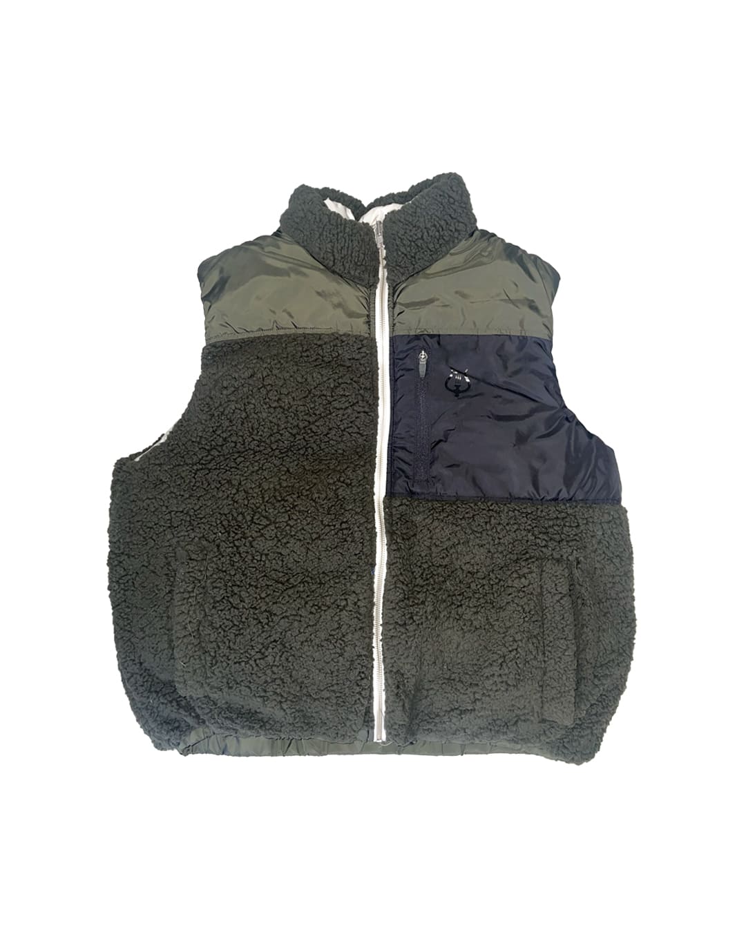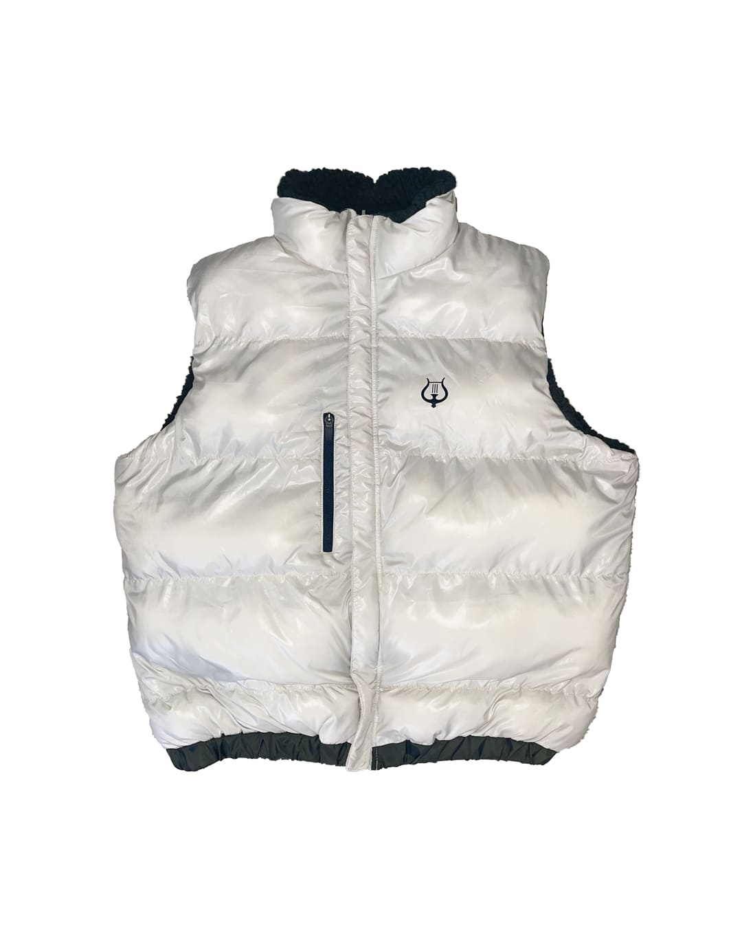 Chaleco reversible de color hueso y verde petróleo con una cara acolchada y la otra de carnero. Incluye cierres YKK y bolsillos secretos.